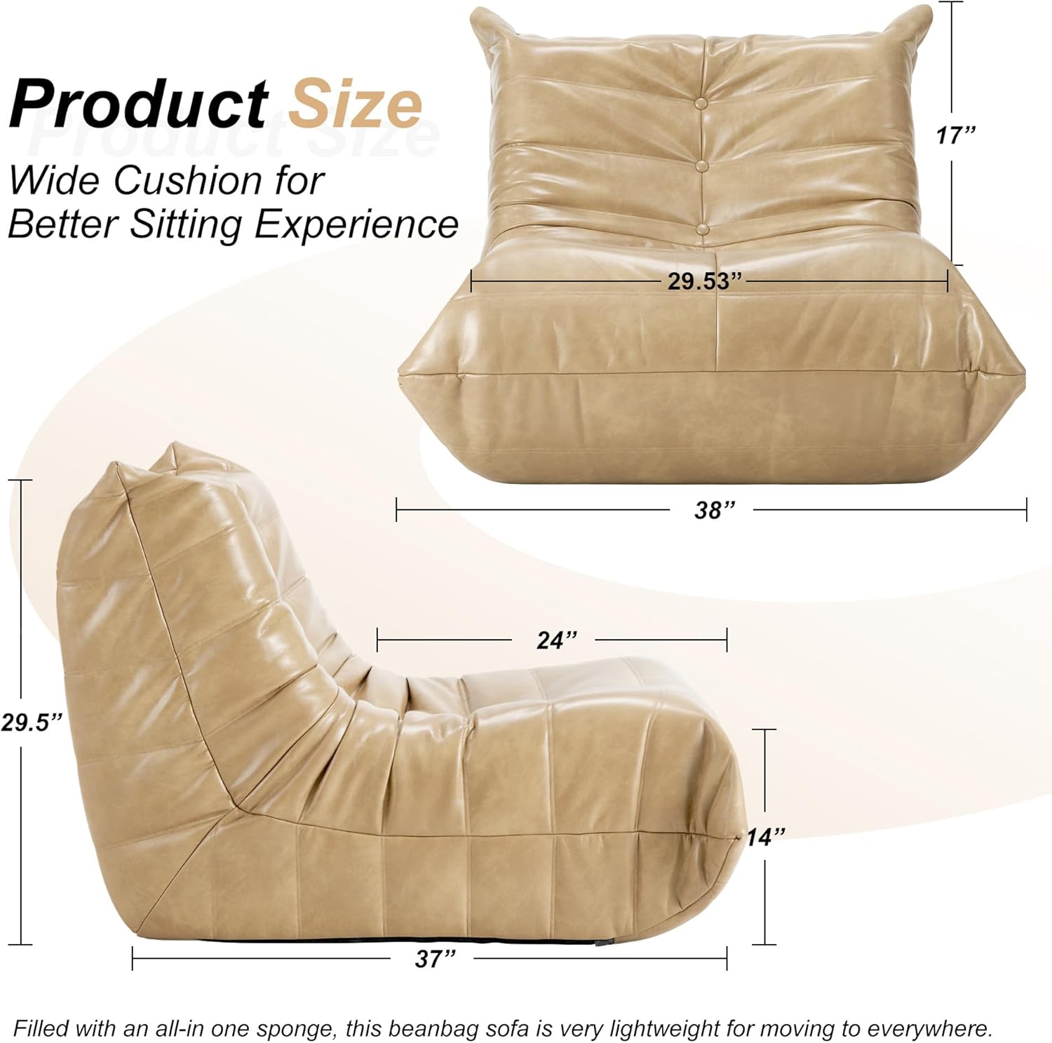 • 【Versatile Usage】With the size of 37″L x 38″W x 29.5″H. Filled with all-in-one sponge, this beanbag couch is only 20.46lbs, very lightweight for moving to anywhere such as dorm, home and even office. Whether you need a gaming chair, a meditation sofa with back support, or a floor couch for watching TV, this leisure chair is the perfect complement to any combination sofa. And its faux leather is very easy to clean just with a wet cloth.