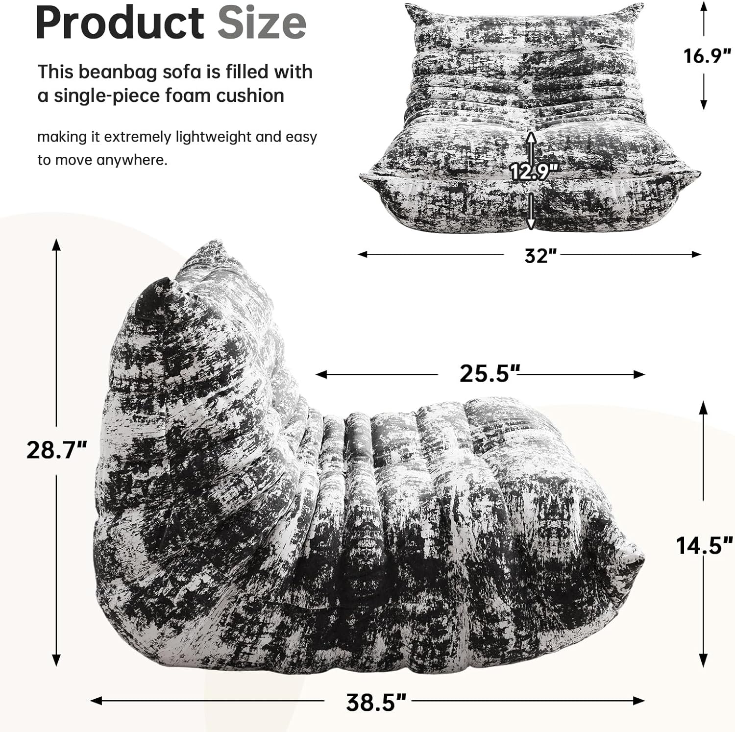 - Multiple Use: Bean bag couch with the size of 38.5″L x 32.3″W x 28.7″H, this cozy lazy sofa is only 24.25lbs, it lightweight to move to anywhere living place on you will,whether as a cozy reading chair, a single sofa chair, or a sleeper sofa. It’s perfect for small spaces like bedroom,living room,apartments,dorm and balcony.